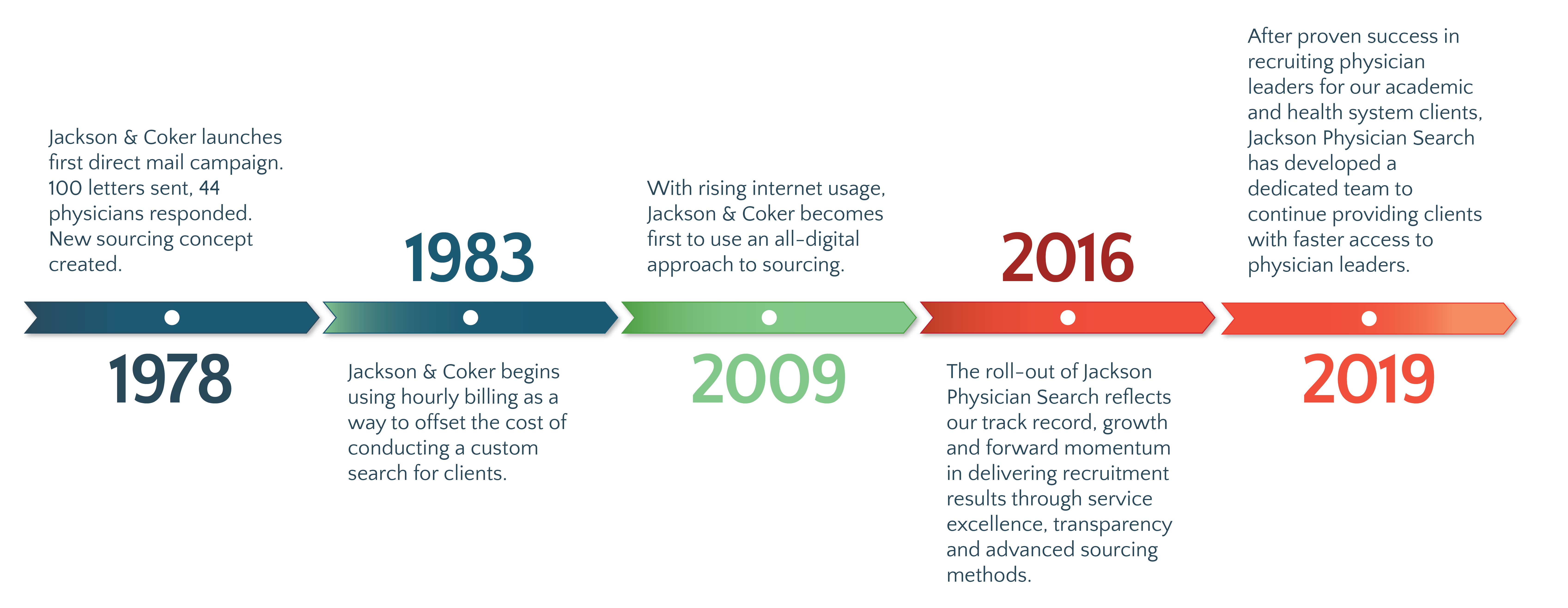 Our proven track record of delivering on some of the toughest searches goes all the way back to the 1970s when Jackson and Coker founded the physician recruitment industry that we know today. A lot has changed over the past four decades, but our commitment to placing physicians who fit, succeed, and stay remains the same.